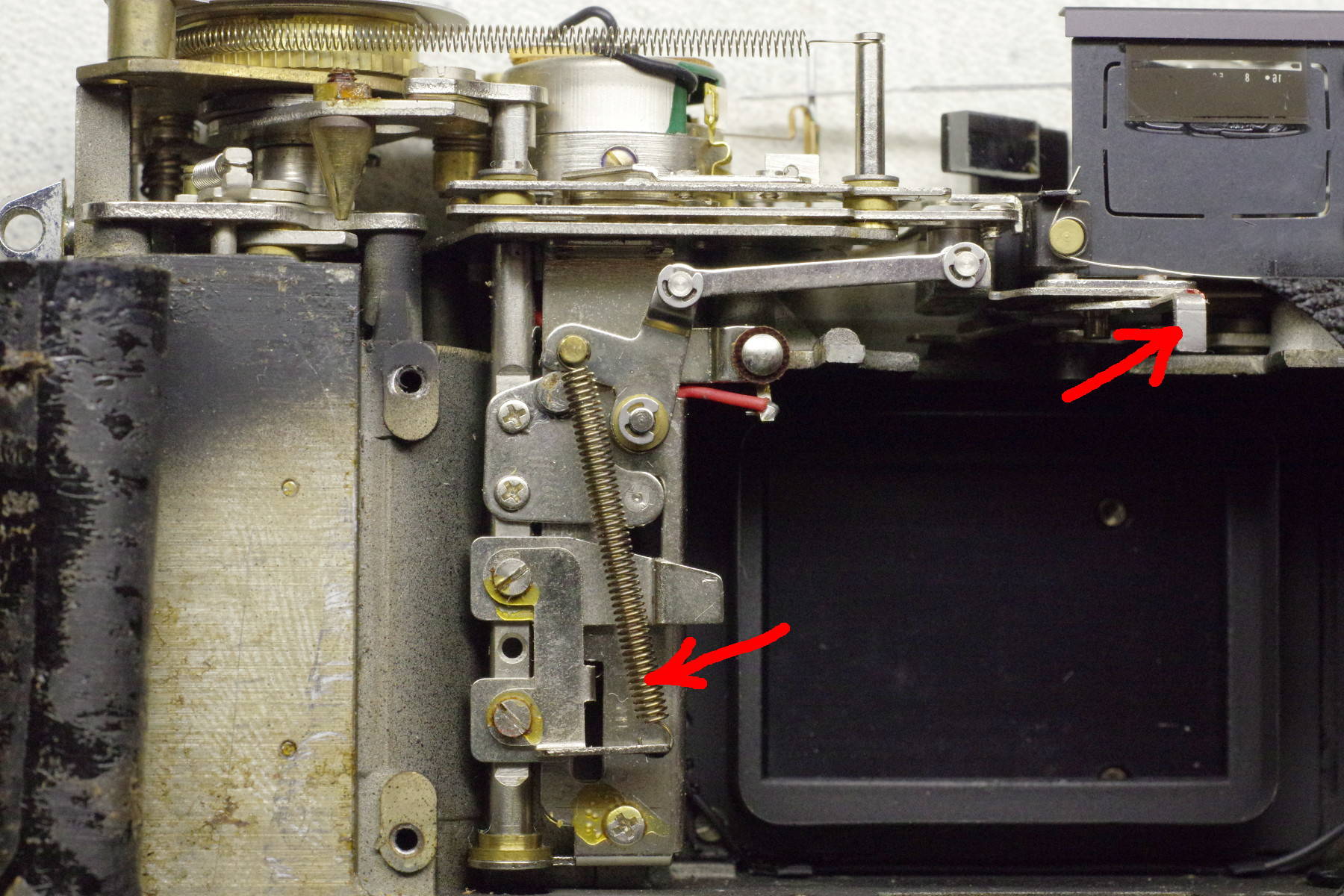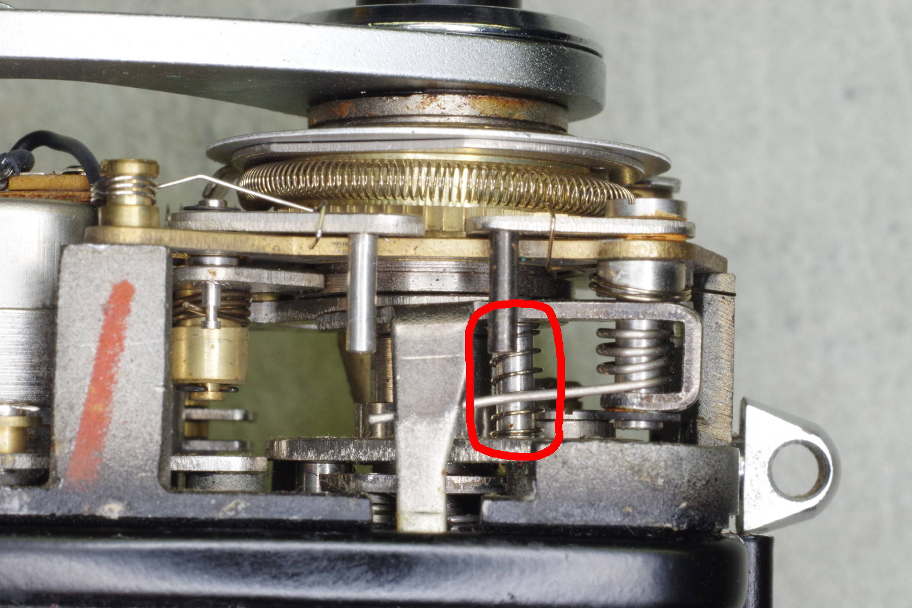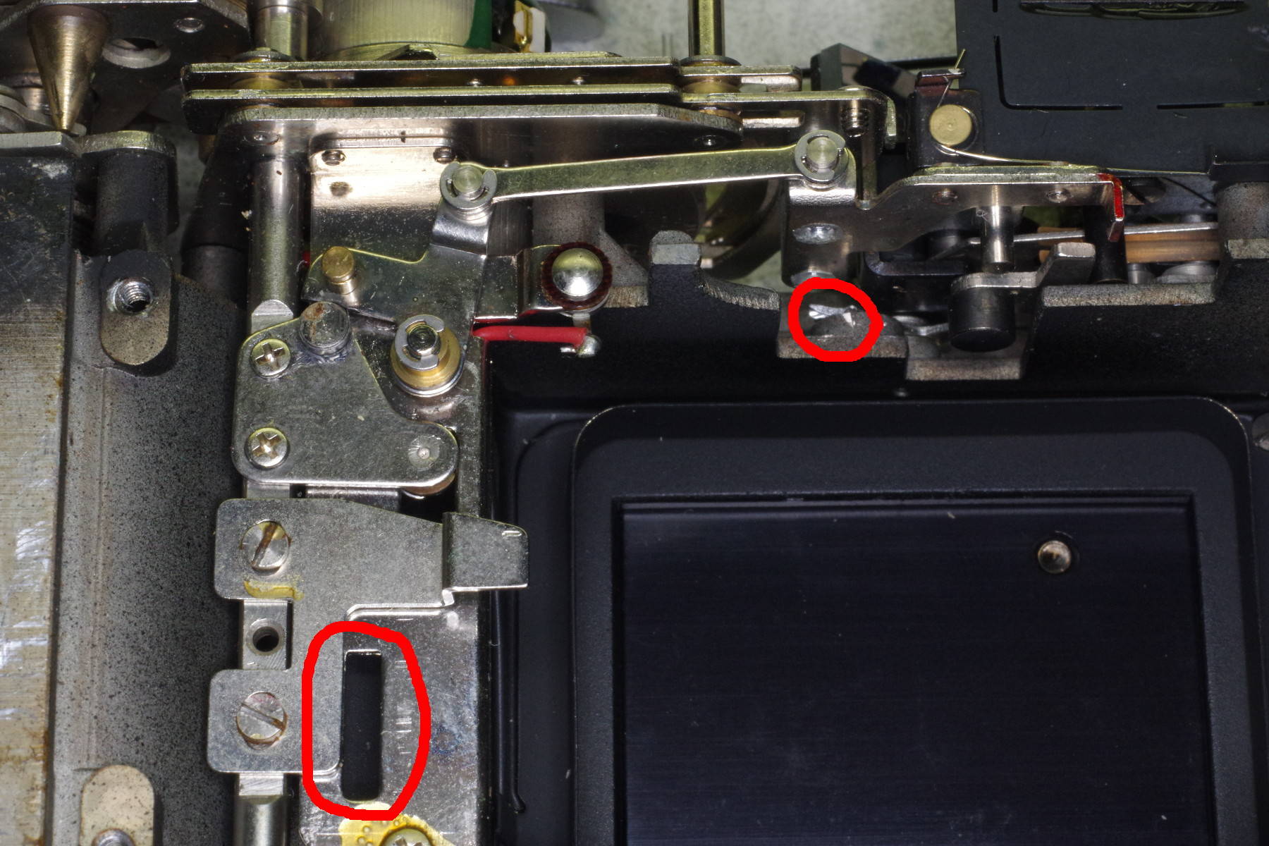 ![]() | Here is a second spring contributing to excessive button force. It is almost completely hidden under a long metal plate, but you can remove it by first removing the shutter-release plate located above the left red circle. As you can see in this photo, this is actually a sandwich two plates: The upper plate holds the spring you wish to remove, and the lower plate is the shutter release. Mark the position of the lower plate (it’s adjustable), and remove both plates, taking care to not let the spring retract under the long plate. |