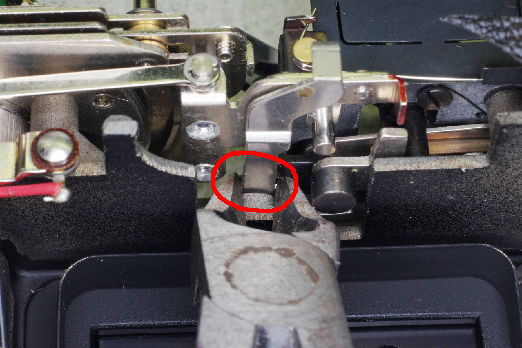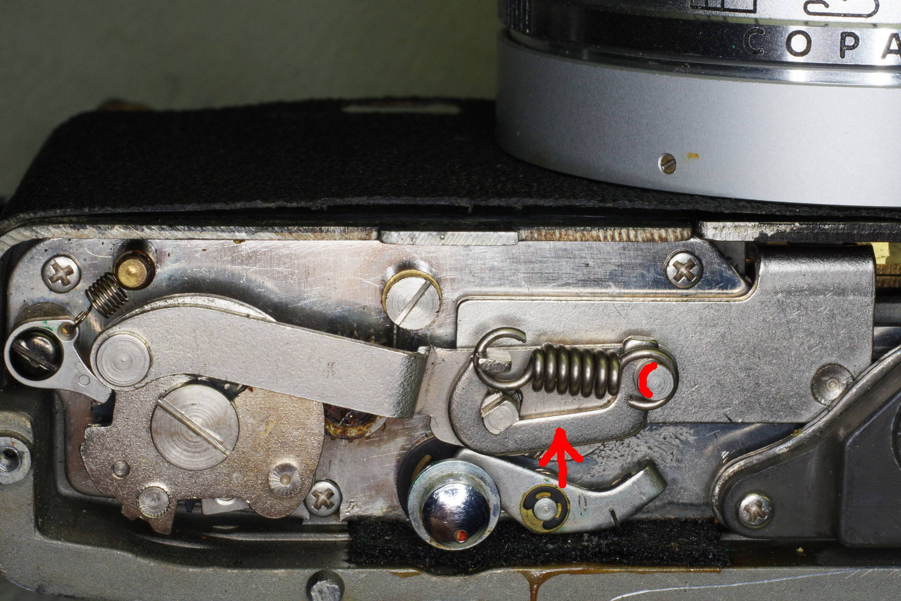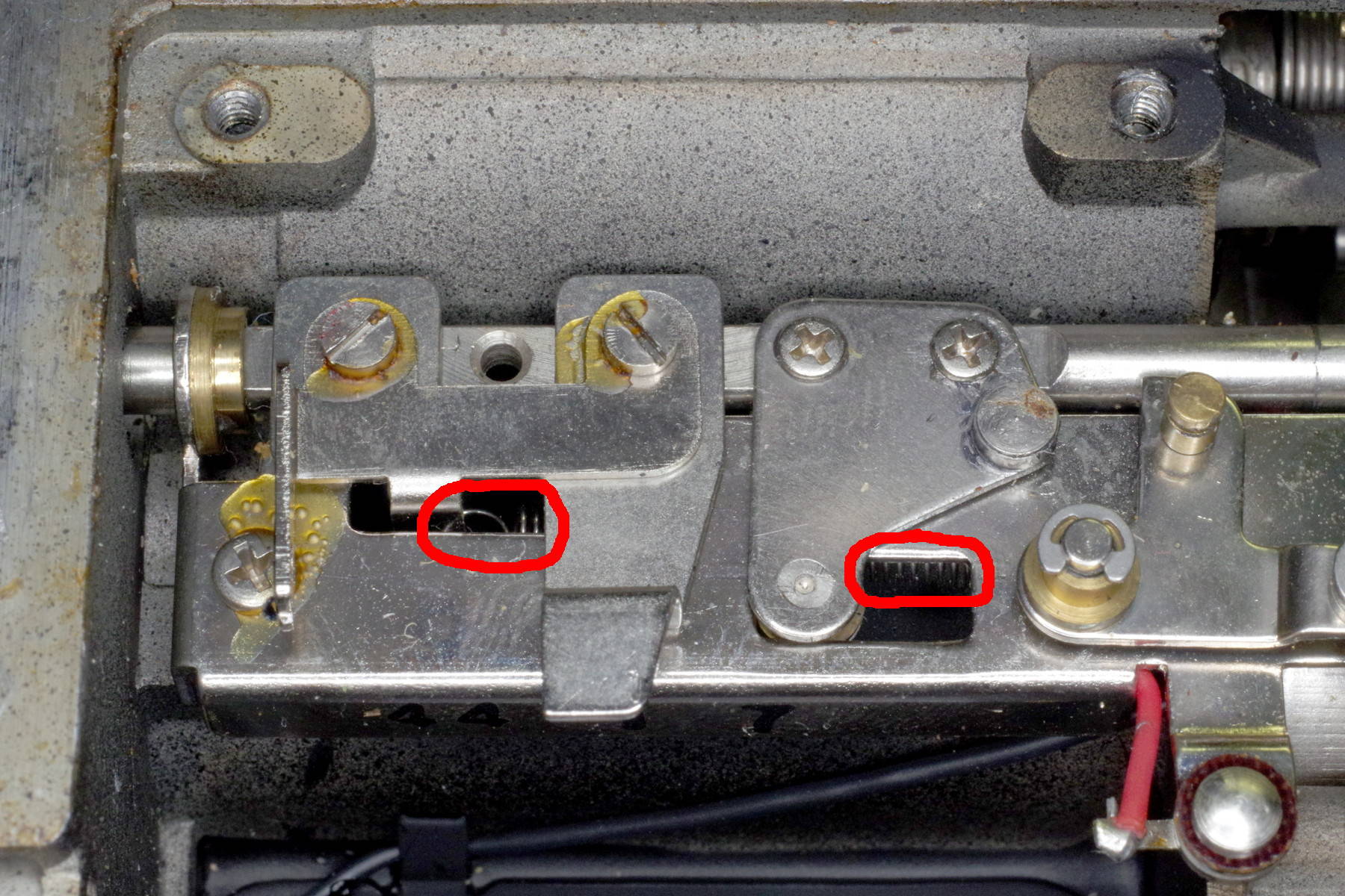 ![]() | Here is a second spring contributing to excessive button force. It is almost completely hidden under a long metal plate, but you can remove it by first removing the shutter-release plate located above the left red circle. As you can see in this photo, this is actually a sandwich two plates: The upper plate holds the spring you wish to remove, and the lower plate is the shutter release. Mark the position of the lower plate (it’s adjustable), and remove both plates, taking care to not let the spring retract under the long plate. |