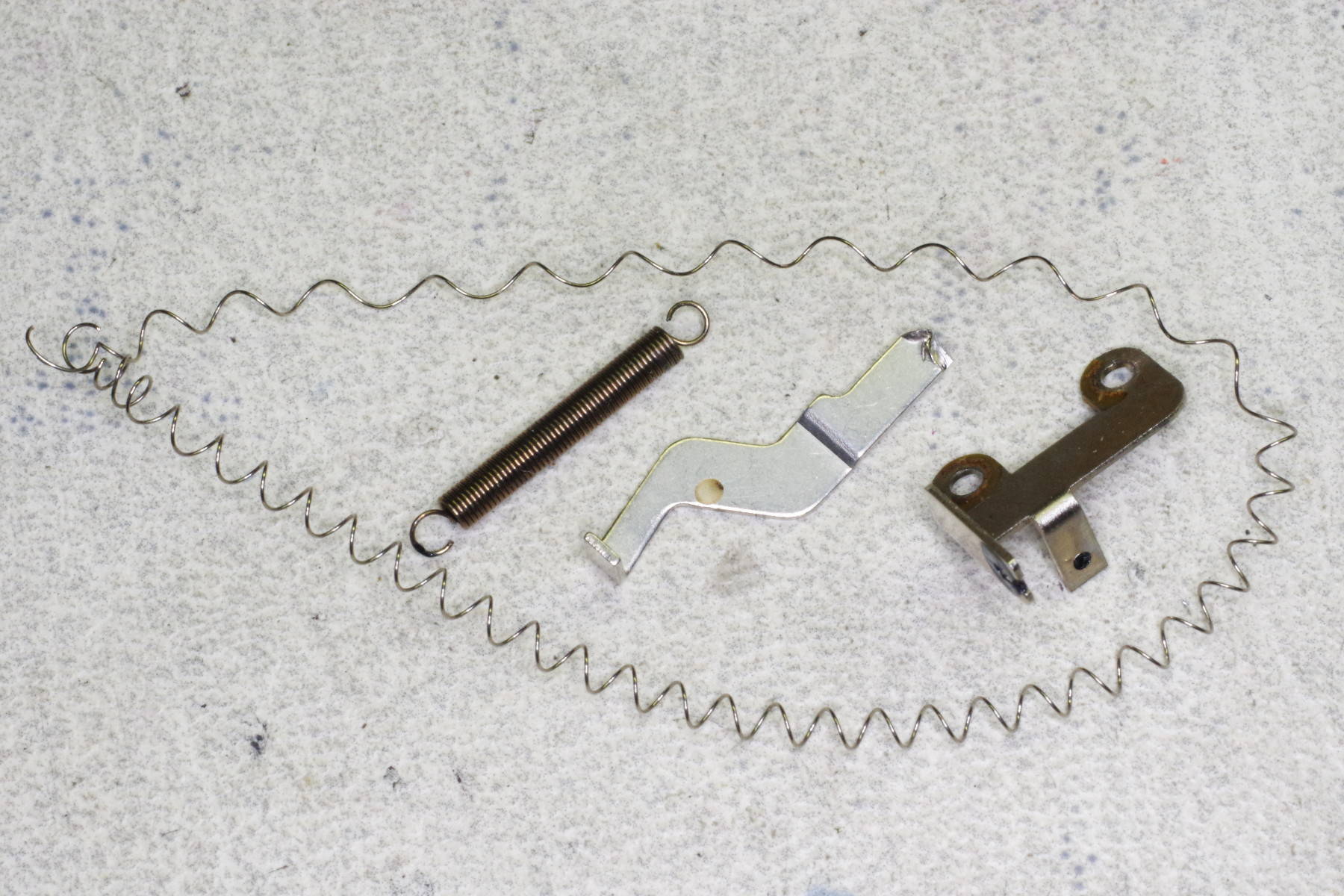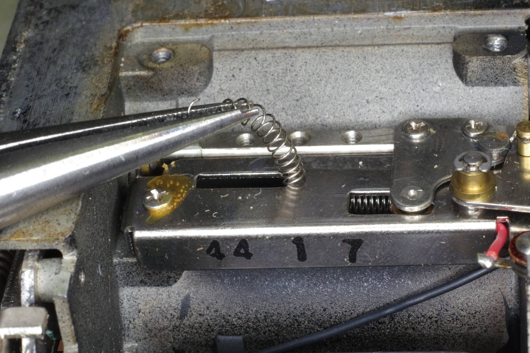 ![]() | The sandwich of plates is gone, giving you space to hold the spring with a needle-nose pliars having a serrated tip, and to pull out the spring. This method of removal is crude, but it eliminates some disassembly. |