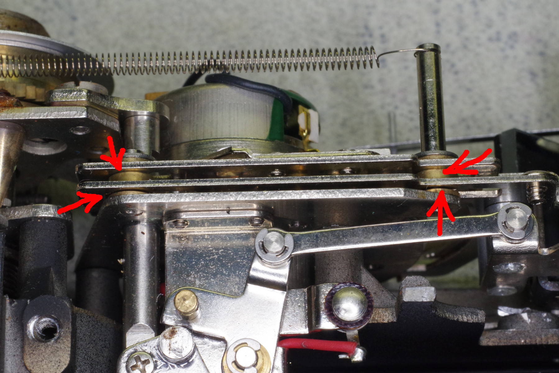 | The heart of the automatic exposure mechanism is two sliders made out of stamped sheet metal, separated by brass spacers marked by red arrows in this photo. The sliders move leftward, and you want them to stay in their position at the right end of their travel. Apply a drop of Superglue (or equivalent) to the brass spacers at the four spots indicated. You probably only need to glue one or two spots, so the extra spots provide sureness. |