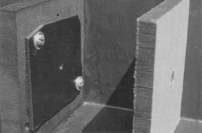 I mounted the mirror to the second baffle at 45 degrees by carefully cutting and gluing scrap blocks of plastic with Super Glue. Avoid vinyl; Super Glue adheres poorly to it. Try to position the mirror as accurately as possible both horizontally and vertically, by measuring angles carefully. Any inaccuracies must be compensated by adjusting the postion of the eyepiece. If you opt for an adjustable lens (instead of an adjustable target assembly), then the mirror need not be mounted to the baffle; it can be mounted to the enclosure instead.