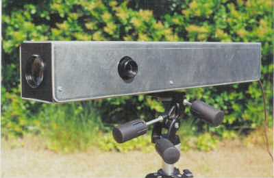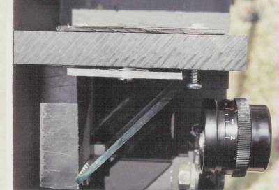 Now the eyepiece must be adjusted for centering and focus. Set-up a camera for calibration (with film in it, shutter open, and focussed at infinity), turn on the light, and make sure the camera is straight and centered as above. Move the eyepiece until the image is centered and brightest in the eyepiece. Then adjust its knob sharpest focus.