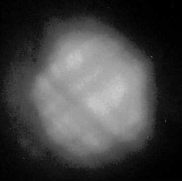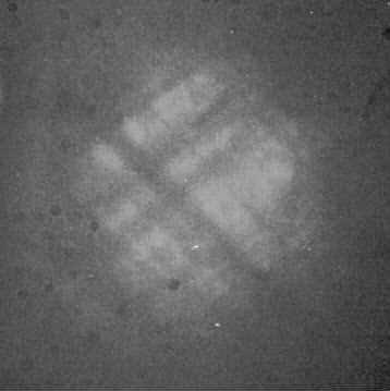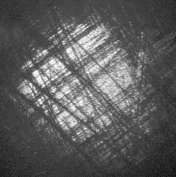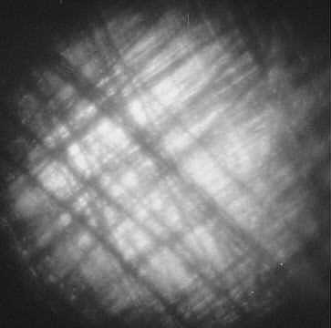These photos have poor contrast because little light bouncing off the negative makes it back into the camera's lens (on the edge, the light tends to bounce away from the lens). Because the image returning into the auto-collimator is so dim, any stray light in the auto-collimator reduces contrast. Without the light baffles, these images would not be visible. When building your auto-collimator, do all you can to eliminate stray light. Also, these photos were taken in a dark room to eliminate ambient light.