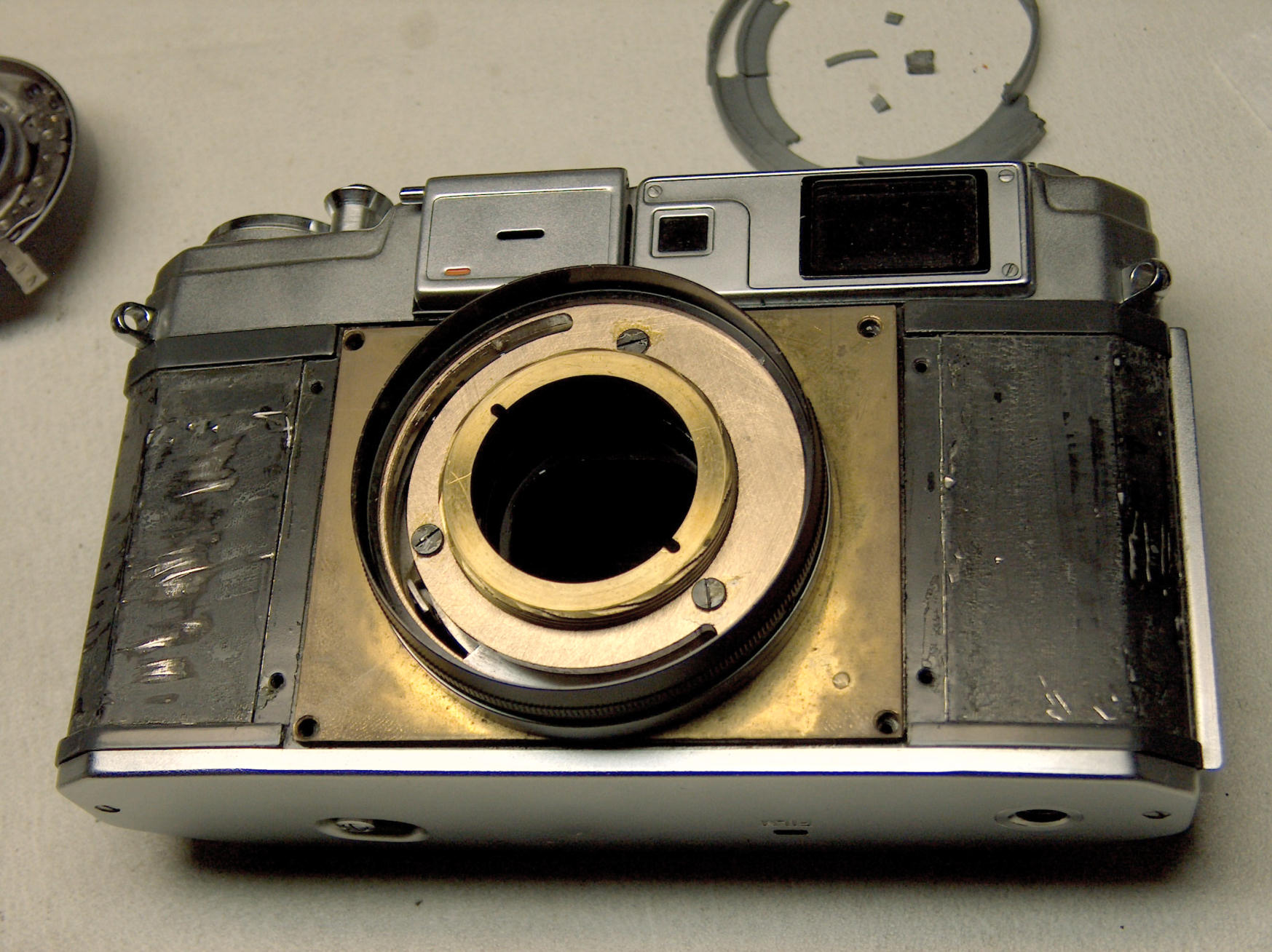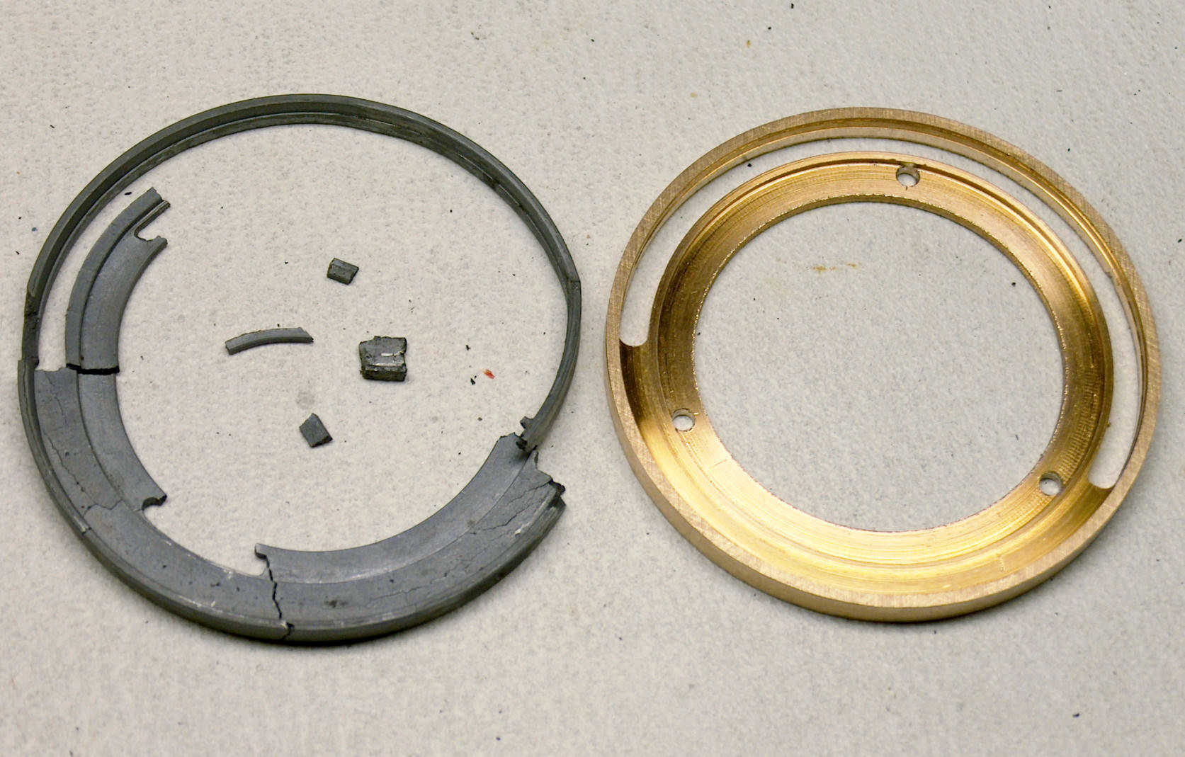 Camera collectors also see this phenomenon in the sprockets of early Edinex cameras, shutter standards of early Iloca cameras, and in the wind levers of early Pax M3 cameras. Years ago, I had access to a machine shop, so I made a replacement ring out of brass, seen on the right. |