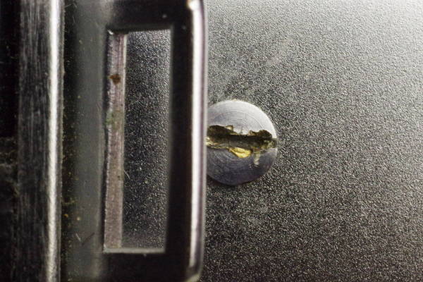 In the prior two photos, you might have noticed that one of the shutter blades has a curved band of scrapes on it (the large red circle). In this photo, we see why. The small red circle identifies a tiny piece of metal that somehow got into the shutter, and was scraping that blade. This metal bit is smaller than an ant, and yet it eventually caused the shutter to jam. In industry, such bits of material are called FOD — foreign object debris. They are destructive in both electronics and machinery. Take care to allow no such bits of FOD to drop into a camera you are servicing. |