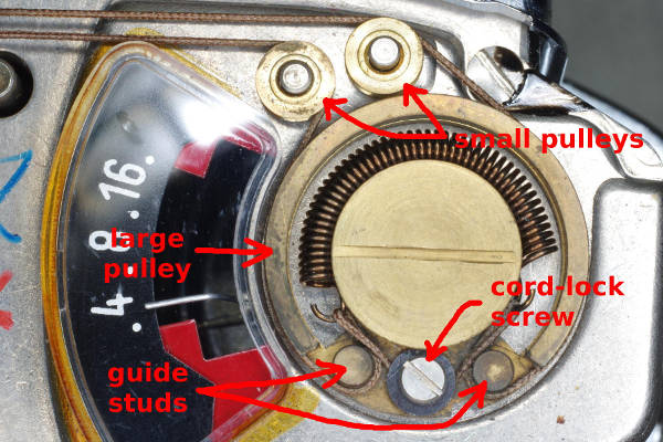 For a second-version camera (with the large cell): Being careful that a cord doesn’t hop off a pulley shown above, change the ASA to 100 and shutter-speed to 125. In the following steps, try to keep the opening of the large pulley facing straight down, as this position will be close to its correct calibration. I don’t know the calibration position for a first-version camera (small cell). Use cellophane tape to hold the cords in place at the upper left corner of the meter. This photo shows part of that piece of tape. The cords run over the meter’s vertical pulleys (not pictured). As shown, install the left small pulley, but not the right pulley because it will get in the way when stringing the left pulley. On the large pulley, arrange the cord as shown. |