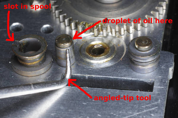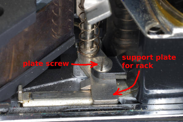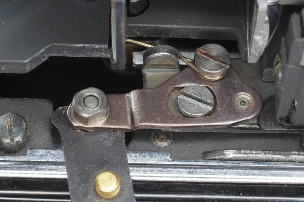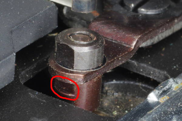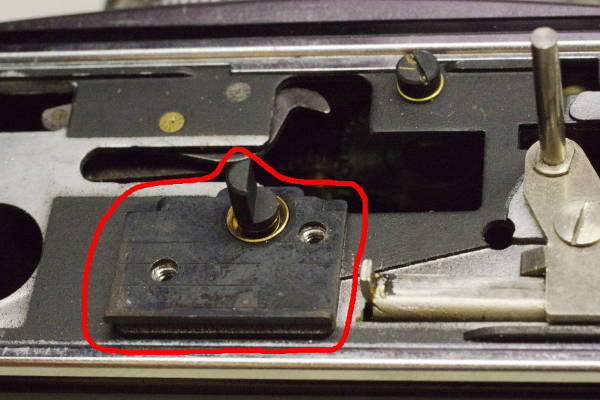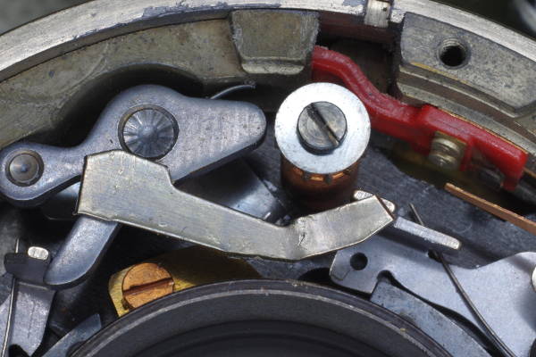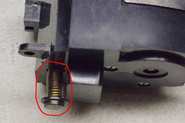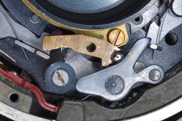 | This RF coupling lever is supported by a little screw that is usually loose. Push the lever up and down to see if there is any play; if so, turn the screw with tweezers to remove the play. Whether it’s loose or not, I recommend securing this screw with a small drop of blue (medium strength) thread-locker (Loc-Tite). Take care to not get any thread-locker into the pivot. |
