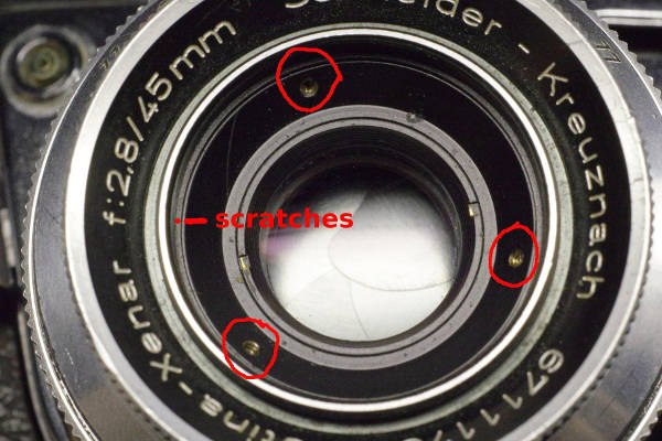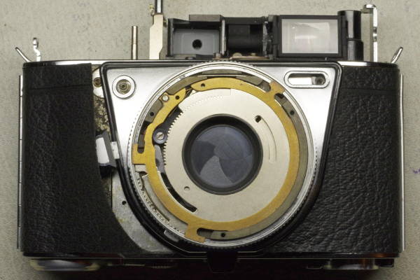 This page is intended for experienced camera repairmen, so it does not explain how to perform common chores such as peeling leatherette. As an aside: Be careful when cleaning the focus-scale of this camera. I cleaned one with Fantastik, which to my amazement dissolved the paint on the focus-scale on the focusing ring, removing some of its numbers. Even water rubbed off some paint! Kodak must have used poor paint on the focus-scale because I’ve never had this problem on any other kind of camera. All other paint on this camera is fine.