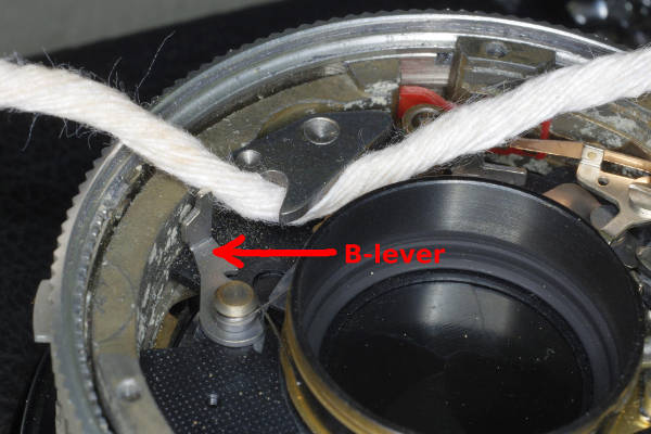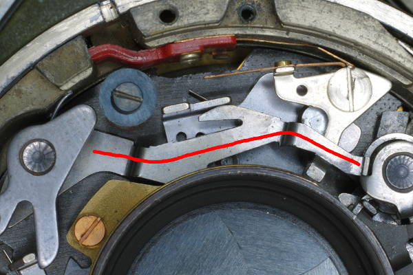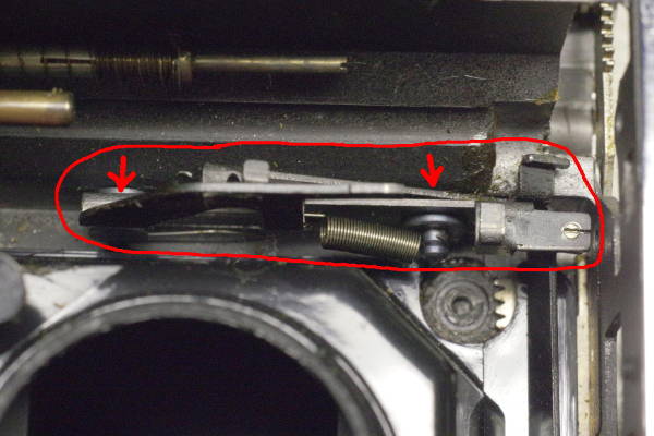 | Inside the shutter, there is a long lever marked here in red. Using needle-nose pliars, bend this long lever at its left end by 90 degrees until it’s pointing up, as seen in the next photo. |