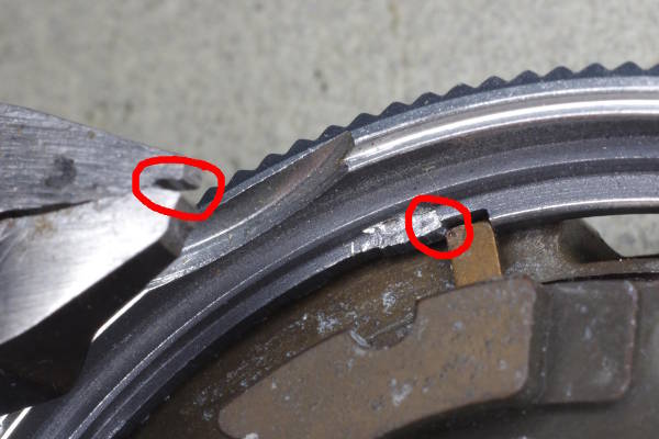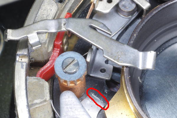 | The aperture ring pushes on only the right side of the aperture-tab, and we rely on a spring to keep the tab pressing against the aperture ring. But if the aperture has some stiffness, it might get stuck. It is stiffest wide open, so check that the spring has enough reserve force to reliably move the aperture at f/2.8. If it does not, you can create a bump in the aperture ring that will press against the left side of the tab, as seen in the right red circle in this photo. The left red circle shows what used to be a small wire cutter modified to compress metal between its jaws, creating the bump in the aluminum ring. You could also create the bump by placing the aperture ring between steel objects, and tapping one of them. Both techniques take advantage of the malleability of aluminum, causing it to flow outwards. You will probably need to file the side of the bump to yield a well-shaped slot for the tab. You can also create a bump at the top-left corner of the tab. |
