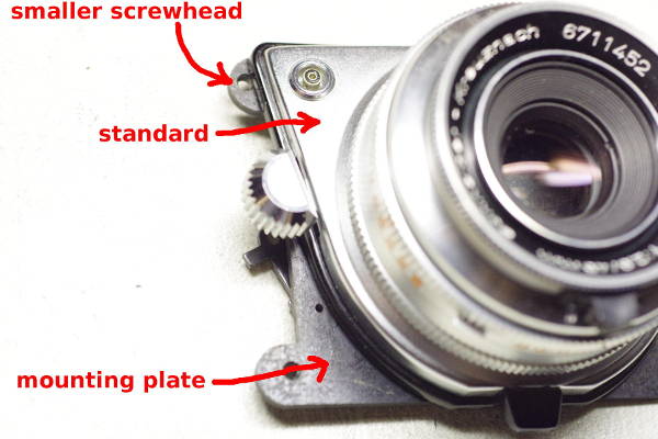 On the body, the mounting plate can be removed by removing four screws, three of which are under the leatherette near three corners of the chrome standard. The fourth screw is hidden under the Kodak emblem at the upper right corner of the standard. This emblem is thin aluminum, and to avoid damaging it, I suggest applying acetone to it for 5-10 minutes to dissolve the glue under it. Then push sideways on an edge of the emblem with the sharp tip of a wooden or bamboo skewer. The emblem will slide sideways and come off. Here’s a brief article showing how to neatly remove this emblem. The upper-left screw has a smaller screwhead than the others to allow it to fit partly under the black plastic trim. Don’t mix it up with the other screws. |