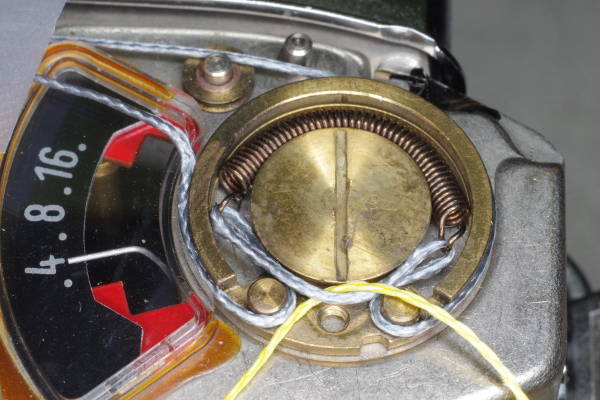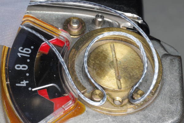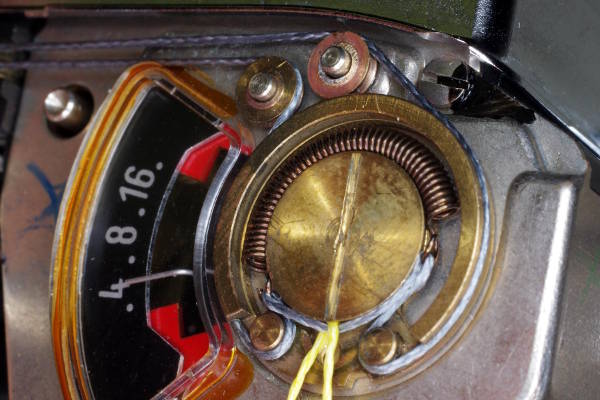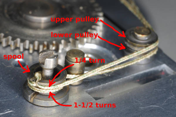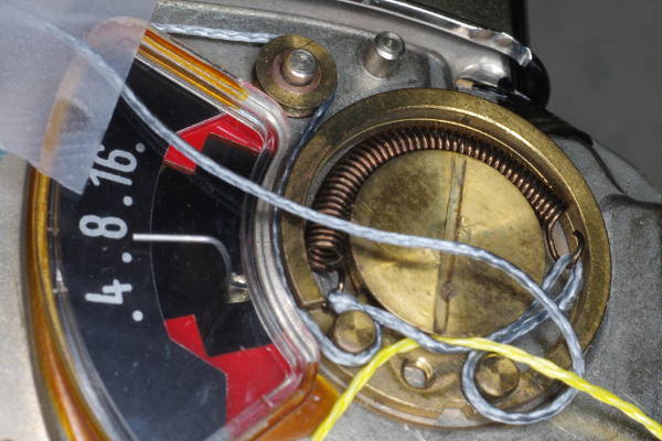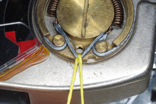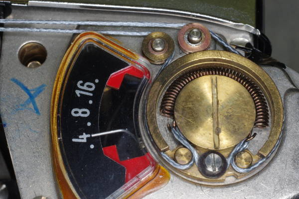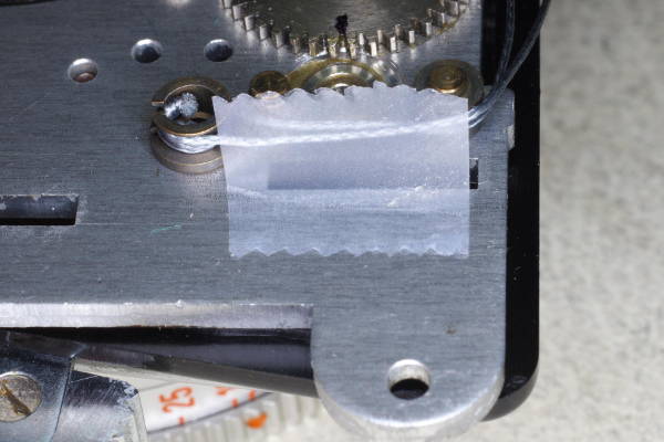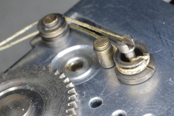 But if the meter is alive and you wish to use it, use a felt-tip pen to mark the cord by the cord-lock screw. You will use this mark to maintain the original meter calibration upon re-assembly. However, I suggest replacing the original cord (made of cotton or somesuch) with braided fishing line, which is considerably stronger and probably not subject to deterioration. Remove the cord-lock screw, and unstring the cord. Remove the two small pulleys. |