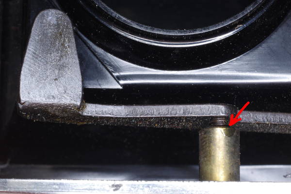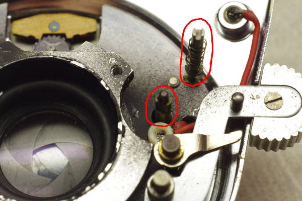 | This photo is looking at the front of the rangefinder, showing the adjusters and their locks for infinity and scaling. The locknut or lockscrew must be loosened some before adjusting. The infinity adjuster is an eccentric, and a slight rotation causes a significant horizontal shift, so rotate it only a tiny amount when calibrating for infinity. Another problem is that the scaling adjuster rotates when you rotate its locknut. This adjuster has two flats on it, one of which is barely visible in the red circle. |