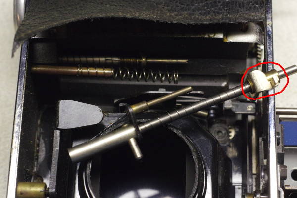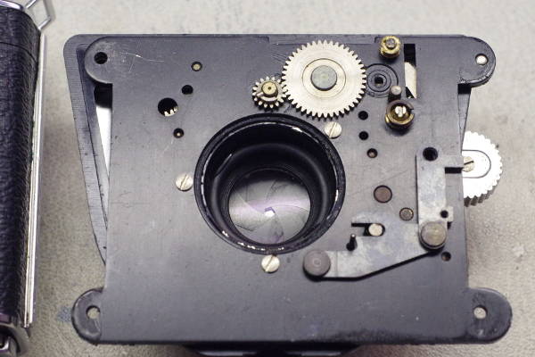This camera has a very low serial number. I examined this mechanism in a later camera, and it has almost no grease in this area. Kodak learned their lesson. |