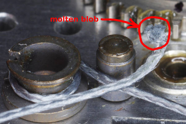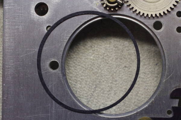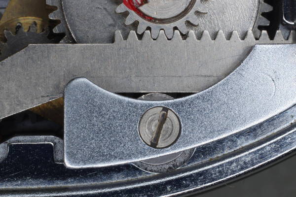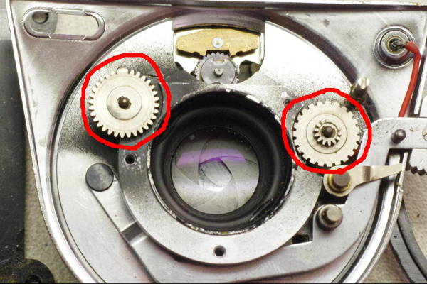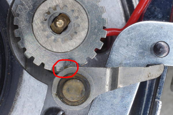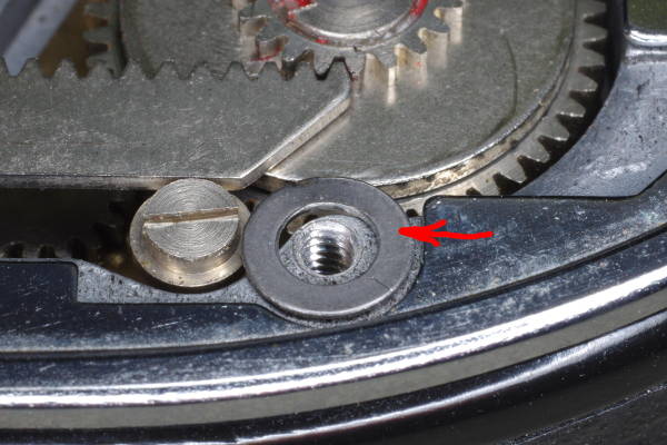 | The advance lever is fully rotated, putting maximum force on this rack and pinion. You can see that the washer prevents the rack from flexing away from the drive-gear above it. Fortunately, the cocking-force in the modified Retina Automatic III is low enough that bracing its rack like this might not be needed. However, I strongly suggest bracing racks in all other models of Retinas with this design-defect, which include the Ib, IIc, IIIc, and IIIC. Here’s how. |