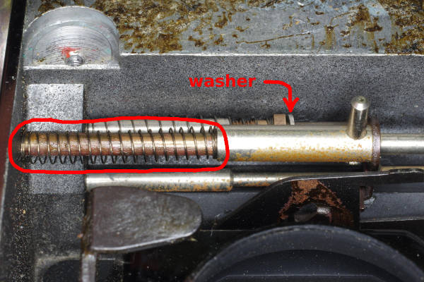 | The cocking rack in this camera is not secured properly, which is a defect in design that can cause racks to bend excessively near the end of the cocking travel, often causing their teeth to wear or strip. You can fix this problem by bracing the rack from behind its teeth. In this photo, I have placed a small washer for the screw securing the right support plate for the rack. I also bent the flat part of the washer down slightly so that more of its area would contact the back of the rack. If the chrome trim-piece lacks a cut-out for a washer here, you will need to remove some material from the trim-piece using a Dremel. |