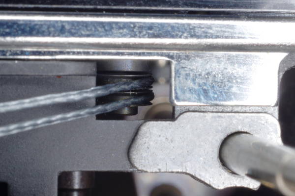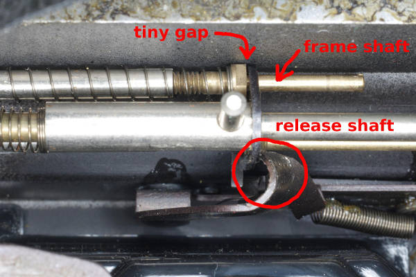 Bend the upper auto-mech lever (which you glued down) so that the slider on the release-shaft leaves a fraction of a mm gap with the frame shaft, as shown. |