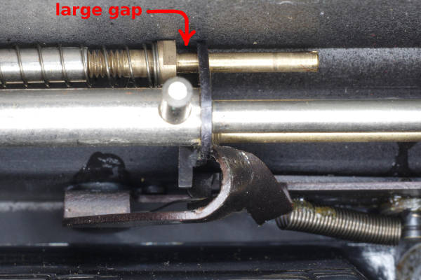 | After pressing down on the release shaft (to take a picture), the frame shaft remains down, leaving the large gap as shown. Upon advancing again, you should see the frame shaft pop upward, leaving the tiny gap. |