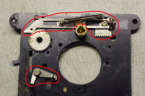| The long lever is shown here sitting on top of the shutter. It was broken off at the red circle in this photo. I had you break off this lever now so it would not press against a tab on the main-cam, which would rotate a part and ruin your gear-alignment upon reassembly later. |