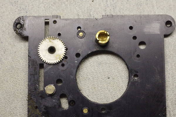| This is the back side of the mounting plate after removal from the body, and removing the cord. This is a different camera than that above; this one has a black mounting plate. Later, you will modify the small gear above the lens-opening. |