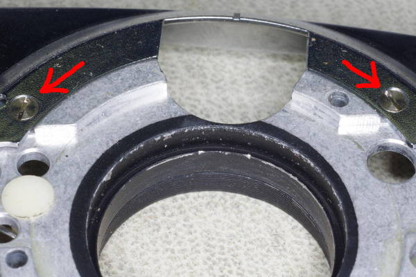 The set-screws for the focus ring are concealed under a decorative ring that’s threaded onto the filter-threads. This ring has no spanner slots; the spanner slots you see in the photo are for the front lens element. This decorative ring can be removed with your thumbs, if you’re fortunate. Otherwise, you’ll need to use a rubber tool on it. Upon re-assembly, do not tighten this decorative ring. Only screw it on snugly enough that it won’t loosen on its own. This reason to avoid tightness is that all the force from this ring is transferred to the three small set-screws shown below; thus, high force can damage the brass ridge against which they press. I have seen such damage. |