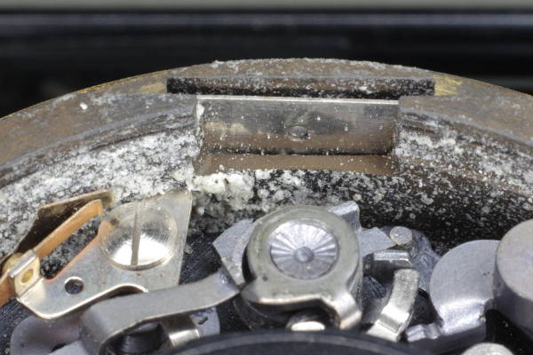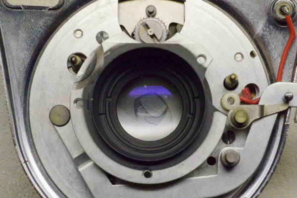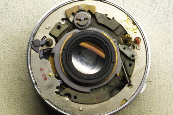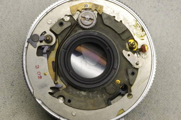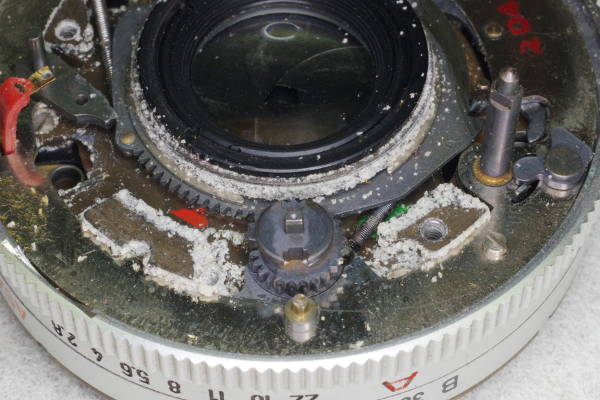 | The metal for the shutter housing is prone to corrosion that produces white, salt-like crystals like this. If the camera has been in a humid area, there might be enough of this corrosion to cause the aperture to be frozen fully open. If so, you will need to disassemble and clean the shutter. The following are some important tips for this chore. |