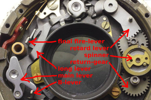 In this photo, you can see the retard mechanism on the right side of the shutter, with three of its parts labeled in red. In the middle of this mechanism, at the 3:00 position of the shutter, there is a brass spinner. I recommend that you clean and lube the bearing and axle of the spinner with moly powder and/or watch oil. To put the spinner back, you must correctly position the return gear and its spring. Assemble any parts you removed from the retard mechanism, but leave the spinner out. Cock the shutter. Rotate the retard lever as far clockwise as possible. Rotate the return gear until the tail of its spring touches the shutter’s throat. Rotate it 1/4 turn more, and holding it in this position, install the spinner. To check the mechanism, rotate the retard lever as far anticlockwise as possible, and slowly release it. Even with such slow release, the retard lever should return to the maximum clockwise position, driven by the spring around the return gear. Fire the shutter while holding the B-lever (8:00 position) outward, and the speed should be 1/30th. That 1/4 turn is what I’ve seen on multiple cameras, so I believe that’s what the factory used. However, you can reduce shutter speeds by rotating the return gear by more than the 1/4 turn recommended above, and likewise you can increase speeds by rotating it less. If you can measure speeds, I suggest rotating the return gear such that 1/30th has the correct time; the higher speeds should fall into place. But I’ll caution you against going much over 1/2 turn because I tried 3/4 turn on two cameras, and their mainspring was unable to (slowly) push the retard lever through its complete movement, which would jam the shutter. |