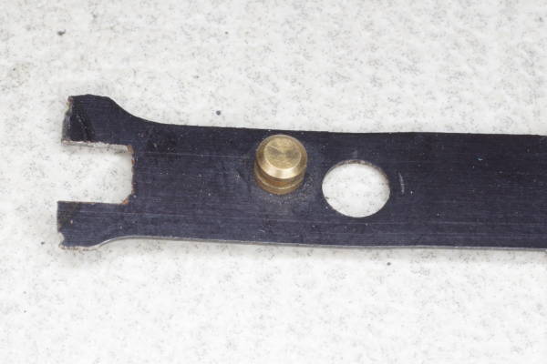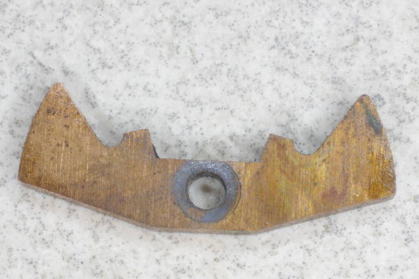 | Optional: Instead of soldering in the brass pallet as described later, you can solder a section of this long lever instead. If you choose to do so, you will need to cut the long lever down to the shape shown here. The metal is soft, and can be cut with a small wire cutter. I prefer the brass pallet because, in my experience, solder adheres more readily to brass than steel. |