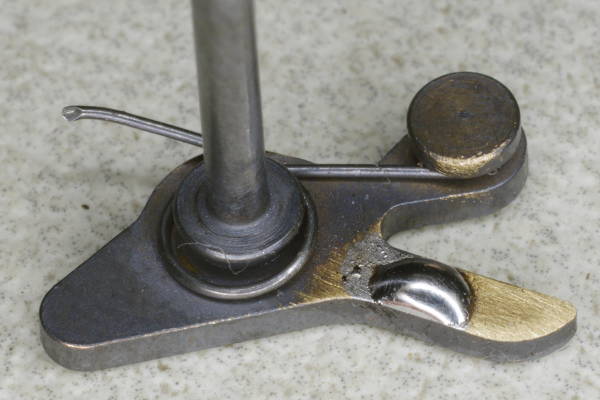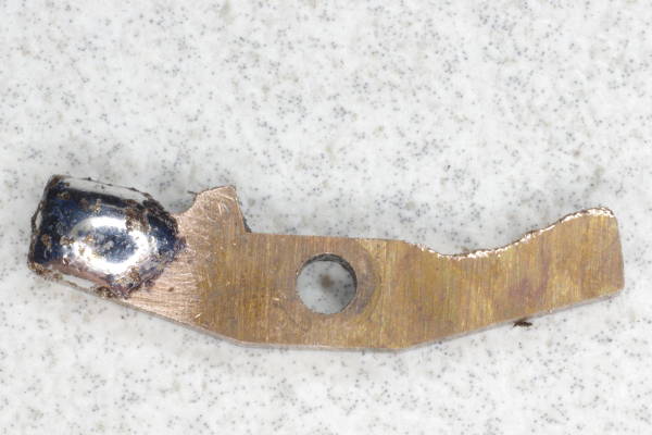 | With that firing-lever gone, you can push out the main fire-lever inside the shutter, and prepare its underside for soldering on the new fire-arm. You will need to file down the blob of solder to be thinner than this example. |