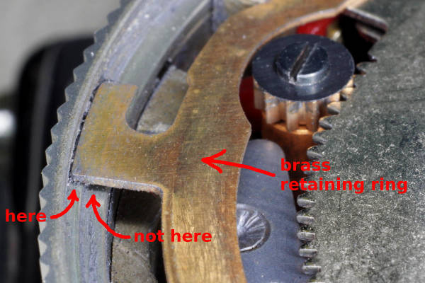When installing the pictured brass retainer ring, note that the tabs on this ring should rest on the outermost (raised) surface as shown (marked “here” in the photo). If a tab is on the inner (lower) surface marked “not here”, the brass ring has probably not snapped into its mating slot encircling the inner wall of the shutter casing. |