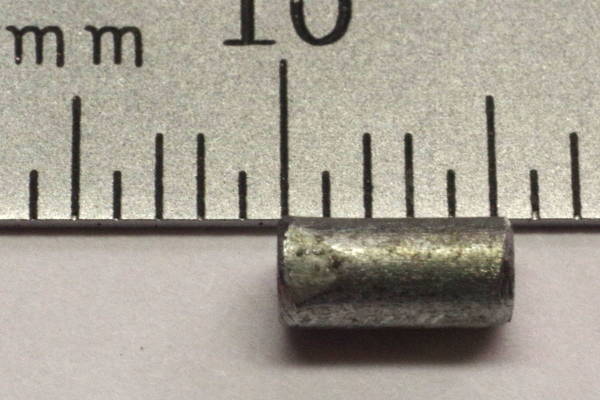 Here’s a problem with the Retina Automatic III camera: The cable release at the top requires that the actuating pin at the end of the cable extend a long distance, and some cable releases might not reach far enough. You can reduce the required distance by placing a slug (spacer) in the brass tube below the release at the top. This tube has a diameter of 3 mm, so you need something a little smaller. Around here, hardware stores sell “hanging wire” intended for hanging false cielings, and this steel wire is 2.6 mm thick (10 gauge). That’s good enough. A suitable nail will also work. Cut a piece that is 5.5 to 6 mm long as shown. Round the edges of your cuts (as seen in this photo) so that sharp steel edges won’t cut into the brass tube. |