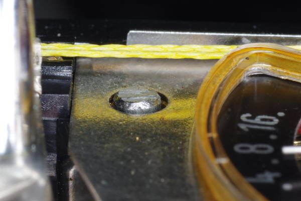 If you are going to replace the cord with braided fishing line, as I recommend, you will need to know how both ends of this cord are strung on the spool. While using a finger at the end of the loop to keep the cord taut and on the upper and lower pulleys, change the ASA to 10 (its lowest setting) and the shutter-speed to 500 (its highest setting). At these settings, the slot in the spool should be facing down (from the camera’s point of view). The cord should look like this and the next photo. There should be 1/4 turn on end of the cord leading to the upper pulley, and 1.5 turns on the end leading to the lower pulley. If there is not 1/4 and 1.5 turns on your spool, then your camera has been tampered with. |