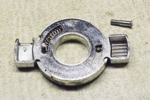 | When reassembling the camera, you might have needed to remove the bottom plate, and if so, you need to reassemble the rotating spring-returned release-cover surrounding the tripod-mount. That tiny spring can easily jump away, but here’s a trick to reassembling it without losing this spring: Assemble the pieces on your work-mat as shown, with only one screw inserted as shown. Insert the spring last. Then pick up the assembly by only touching the round cover-piece, thus ensuring that the two large pieces stay together, and push the assembly onto the tripod mount. Doing so pushes the screw out some, but everything will stay together. When pushing on the assembly, keep the assembly in the orientation pictured here, with the screw pointing up, causing you to push the assembly up onto the bottom of the camera. Then tighten the screw in it, and then put in the other screw. |