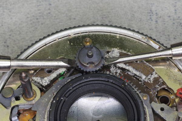 | You must remove the cocking gear, and unfortunately, it is pressed on rather hard. I lifted it off with two screwdrivers as shown. Important: To avoid denting the aperture ring, place bits of metal under the screwdrivers to raise them a little. |