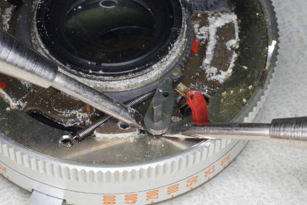 The other side of the mounting plate has some parts on it related to auto exposure. Remove the horizontal slider at the top. Also remove the lever at the lower left. But it’s riveted on, so you’ll need to break off both parts of the lever, unless you wish to drill-out the rivet. I slide a screwdriver under each part of the lever, tilt it upward as far as possible, and then bend the piece back and forth until it breaks off from metal fatigue. |