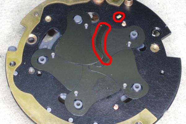 | Lifting off the brass rotor reveals the aperture leaves. This photo shows that when you reassemble the leaves, you must (1) orient each leaf so that its two pins are on its anticlockwise end, and (2) assemble the leaves in anticlockwise order. Note that the aperture leaves rest on the stator plate. |