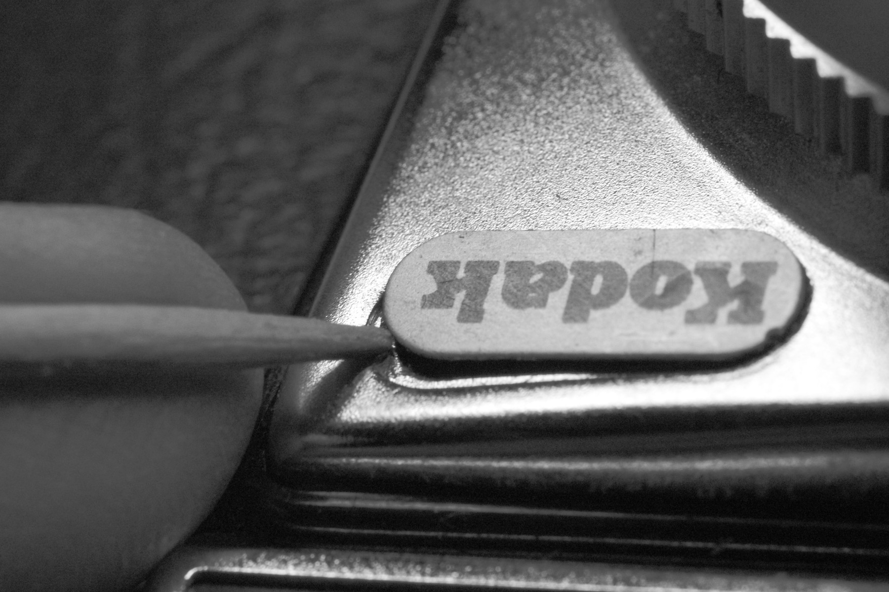 First, you must apply drops of acetone to the edges of the emblem often enough to keep it damp. The acetone will wick under the emblem, dissolving the glue. You will need to apply a drop every 10 seconds or so. To apply a drop of acetone, I dip the shank of a screwdriver in the acetone, and then barely touch the tip of the screwdriver to an edge of the emblem. Touch as gently as possible to avoid scratching the standard or emblem. |