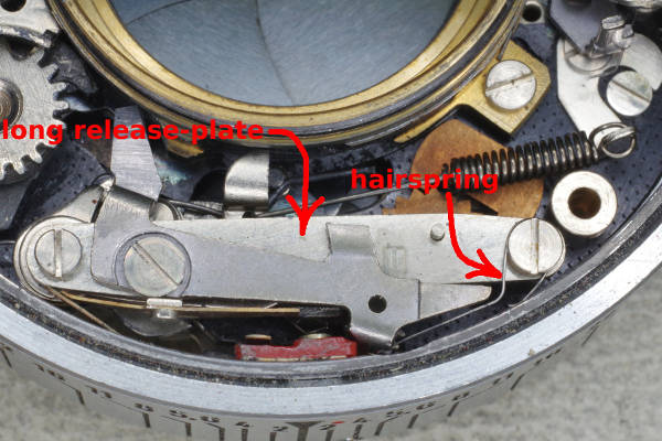 Disconnect the left end of the hairspring (labeled in red), so that it won’t fly away when you remove the right screw securing the long release-plate. Now remove the long release-plate. |