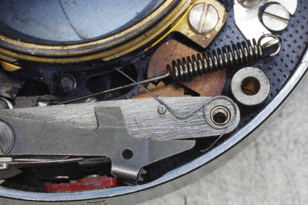 Now you must put back the flash lever and long release-plate, along with its hairspring. Then reattach the cocking ring to the front of the shutter. |