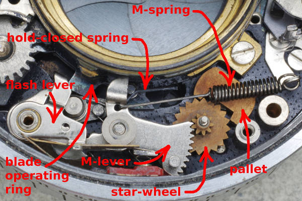 Note that the star-wheel remains in the shutter, even though it can easily be removed. It must be present in order to prevent the pallet from rotating too much and obstructing the blade operating ring. |