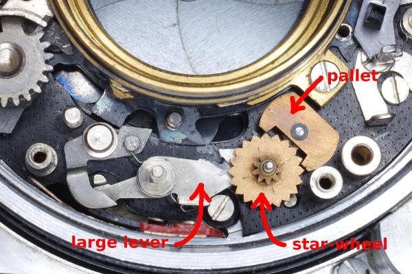their closing pin strikes the closing cam driven by the mainspring, shown at the right arrow.