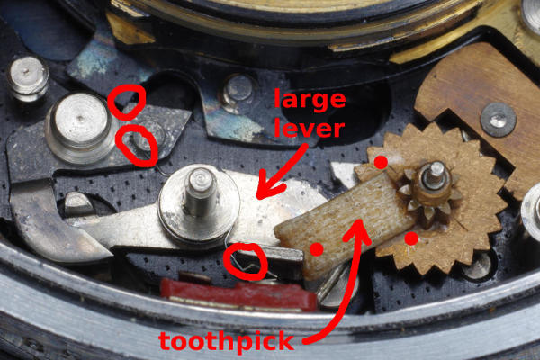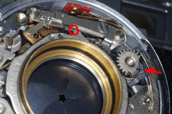 A good way to lock it fully clockwise is to place a piece of toothpick into the pictured position. The piece should be 4.5 mm long, and no more than 1.1 mm thick. If it’s any thicker, it will interfere with the tab on the long release-lever. If yours is too thick, you can make it thinner by squeezing it between the jaws of a smooth-jawed needle-nose pliars. A hint: First place the left end of the toothpick into the correct position, and then press down on the right side until the toothpick sits flat on the star-wheel. That will cause the left end to rise a little because there is extra space under it on the left side. The toothpick’s fit should be snug. Apply drops of Superglue at the three red dots to ensure the toothpick will not slip off. I also covered the top of the toothpick with Superglue so the glue would soak into the wood, turning the toothpick into a solid chunk of plastic. An alternative method I’ve not tried is to solder a piece of thick wire to the star-wheel and file a “V” into its left end so it will lock itself in place while holding the large lever fully clockwise. Unlike soldering, an advantage of using the toothpick is that this modification is easily reversible: One would simply soak the star-wheel in acetone to remove the glue, and then reinstall the parts that were left out. The two lower red circles identify the ends of a tiny spring. Make sure they stay in these positions, because this spring will be your new hold-closed spring. The left end of the spring presses against a lever at the left, rotating it anticlockwise, causing it to push against the blade operating ring (top red circle). This modification causes this lever to always press against the blade operating ring. Consequently, this lever and the spring together always hold the blades shut, even when the camera is jarred with a knock (which I tried on two cameras). Thus, you no longer need the hold-closed spring, eliminating troubles due to its added friction on the blade operating ring. |