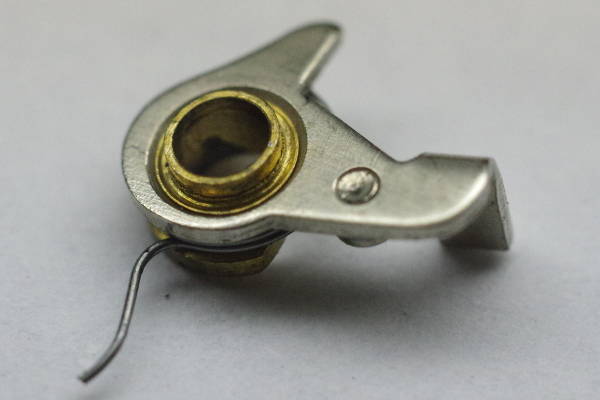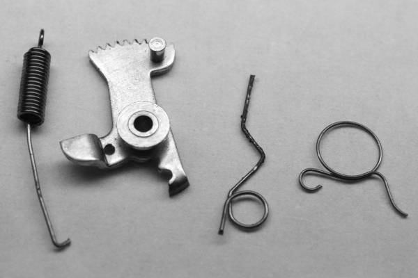 | Here is a close-up of one of the levers you removed earlier. Remove the spring that is attached to this lever. |