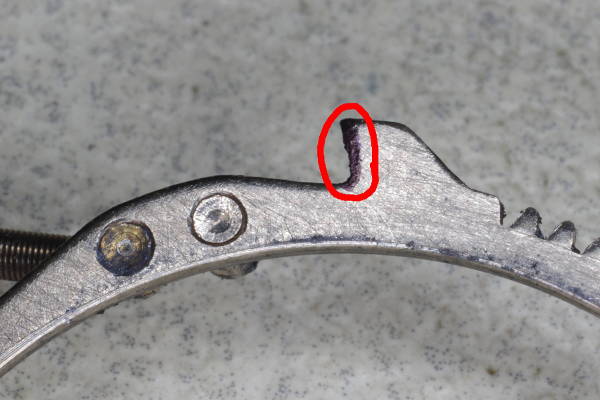 | It is easier to remove and reinstall the hairspring by first not only disconnecting it, but also positioning it as shown. The screw may then be removed or installed without the hairspring shooting away like a squirted watermelon seed. |