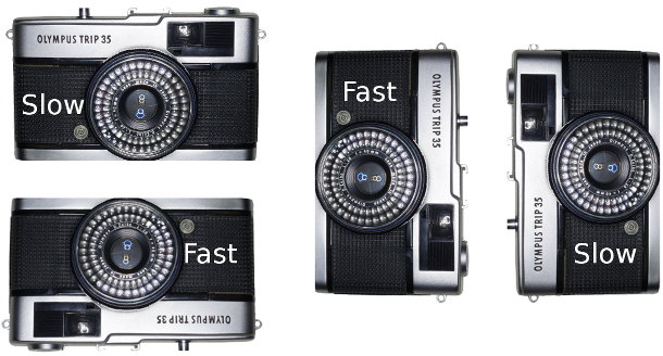 | The Olympus Trip 35 Pen EE family of cameras have fully automatic exposure-control employing a two-speed shutter with speeds of 1/40 and 1/200. They also have a ring for manual aperture control, but using it restricts you to only the low shutter speed because manual aperture control was intended to be used only with flash. But you often want to shoot a subject that is back-lit with a bright background, and the simple automatic-exposure mechanisms used in these cameras produce semi-silhouettes in this common lighting-situation. So it would be helpful to be able to set both shutter-speed and aperture manually. It turns out that it’s not difficult to modify these cameras to give you full manual control over both speed and aperture, and this article explains this modification in detail. But be warned that you will lose automatic exposure-control; the camera will become manual-only. There is no speed selector on the camera, so after the modification, how do you suppose you choose between the two speeds? | ![]() |