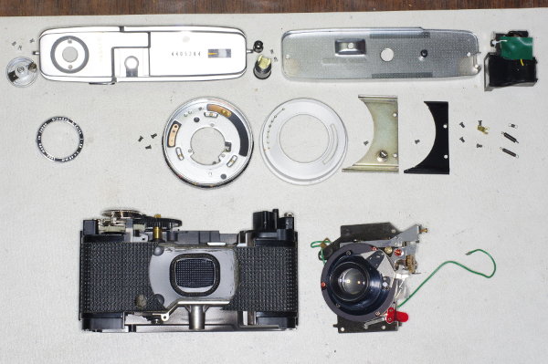 If you only wish to clean the aperture or shutter blades, and are NOT going to make the manual-speed modification, then you can skip the beginning steps below telling you to remove the top- and bottom-covers of the camera.