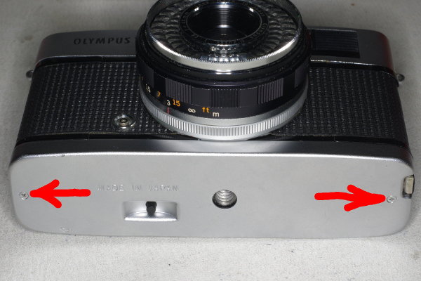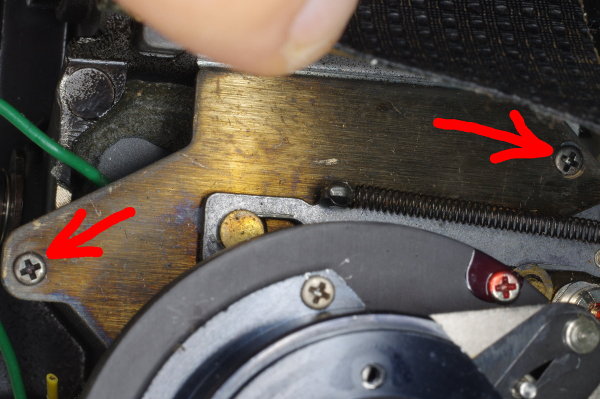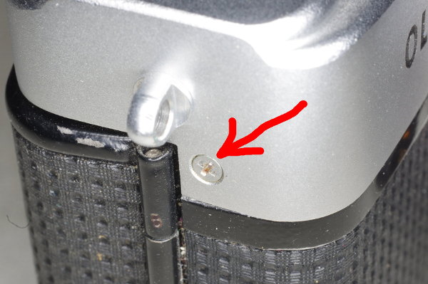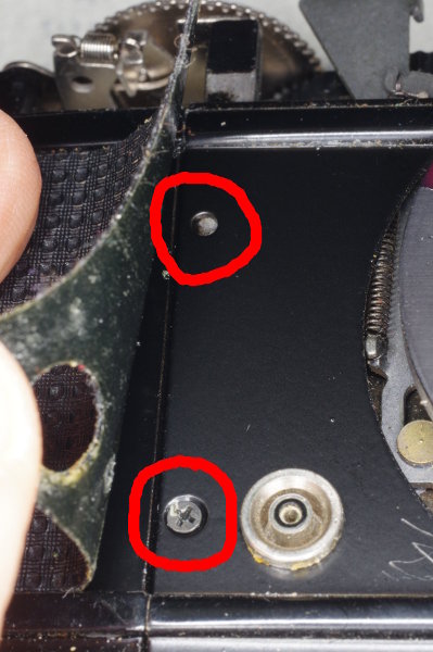 | The large shutter-plate is secured by four screws, and here are two of them, which you must remove. |