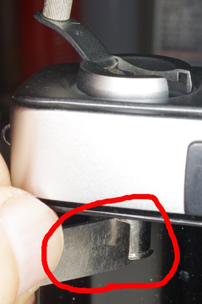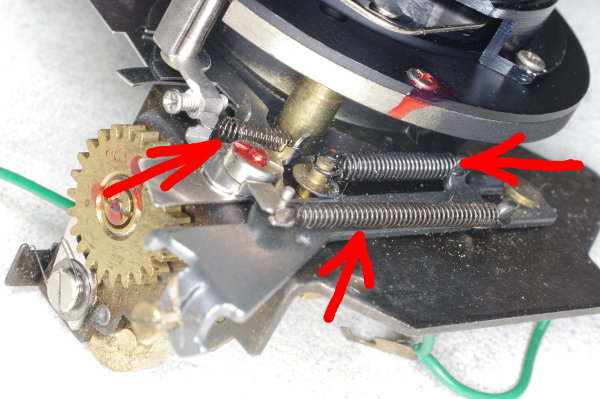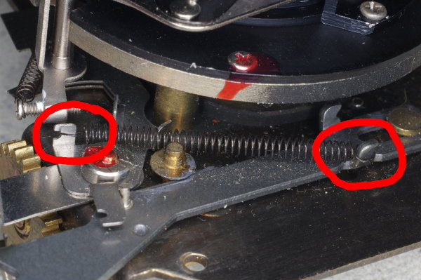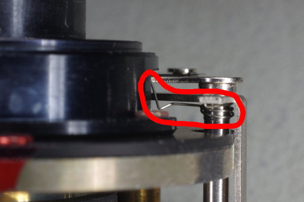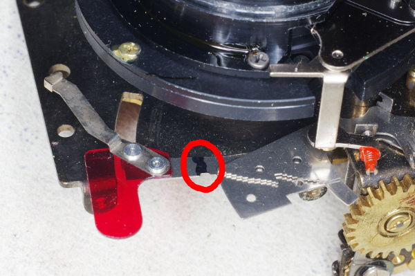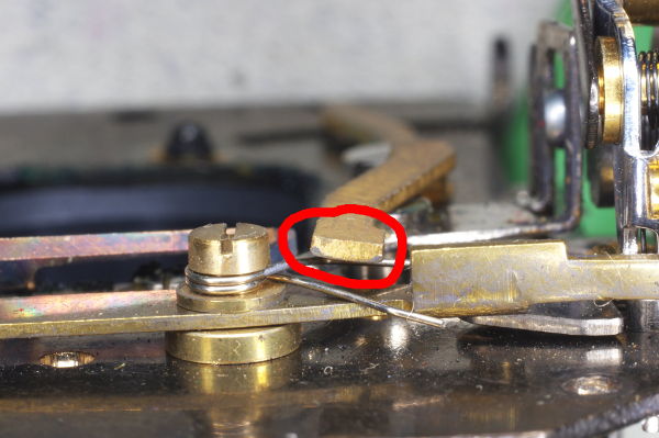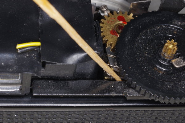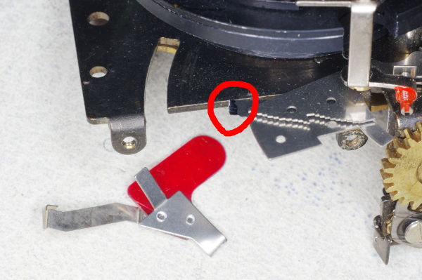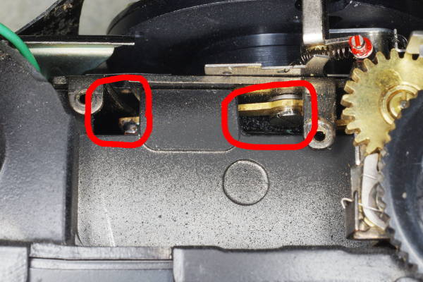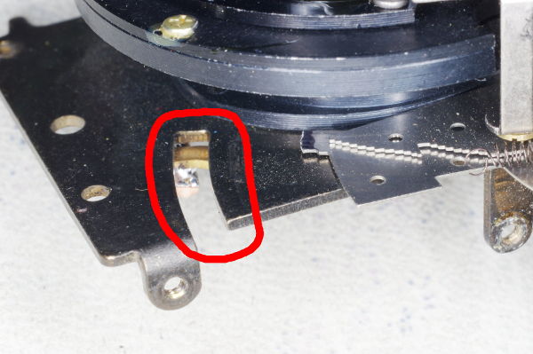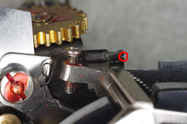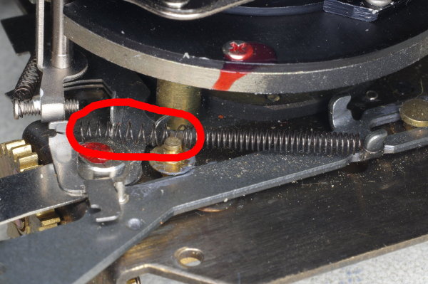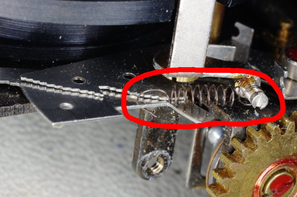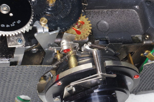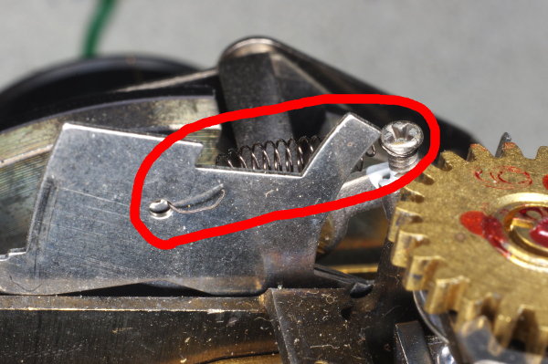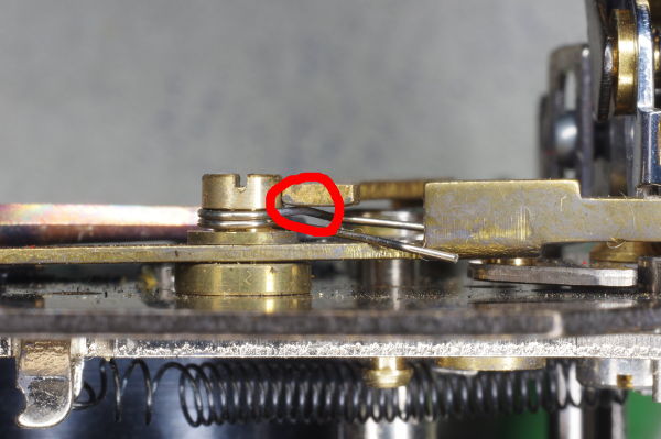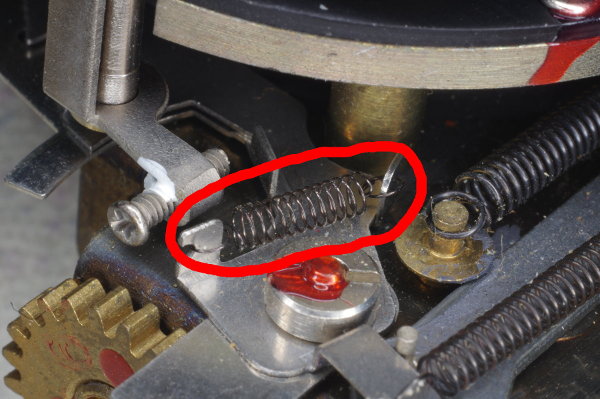 | The speed-lever was slightly stiff on one camera I modified because the other end of the speed-lever pressed gently against the spring shown. Giving that the lever is moved by gravity, even this slight friction can cause trouble. |