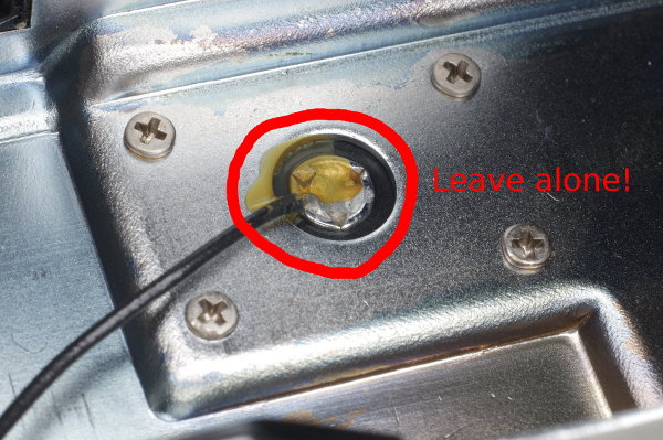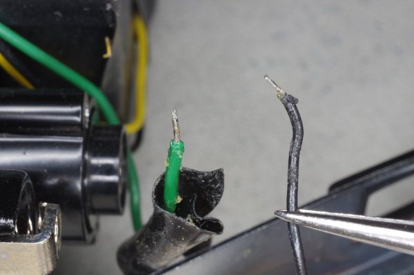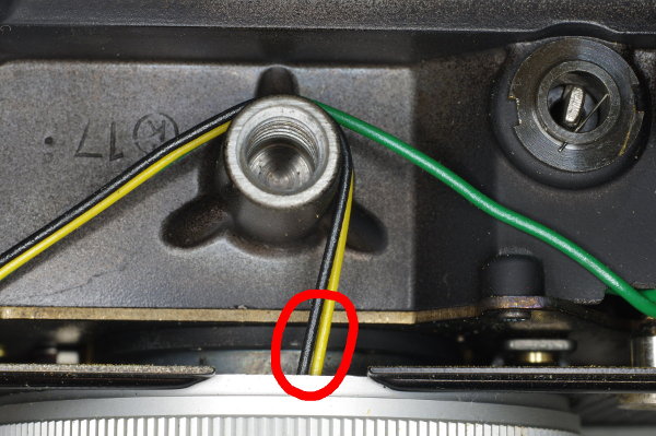 | Here’s the black flash-sync wire at the hot shoe. Do NOT unsolder this. Doing so will melt the surrounding plastic and cause the metal connector to fall out. Don’t ask how I know this. |