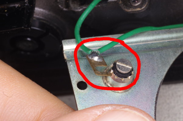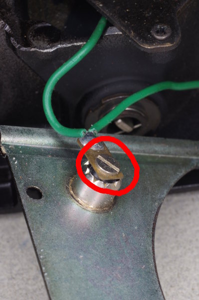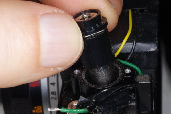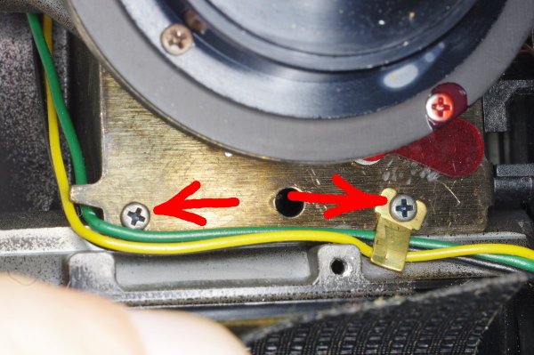 | The green flash-sync wire is soldered to a lug that is secured by a screw. Loosen but do not remove this screw. When reassembling, be sure this lug is oriented as shown (pointing up). |
